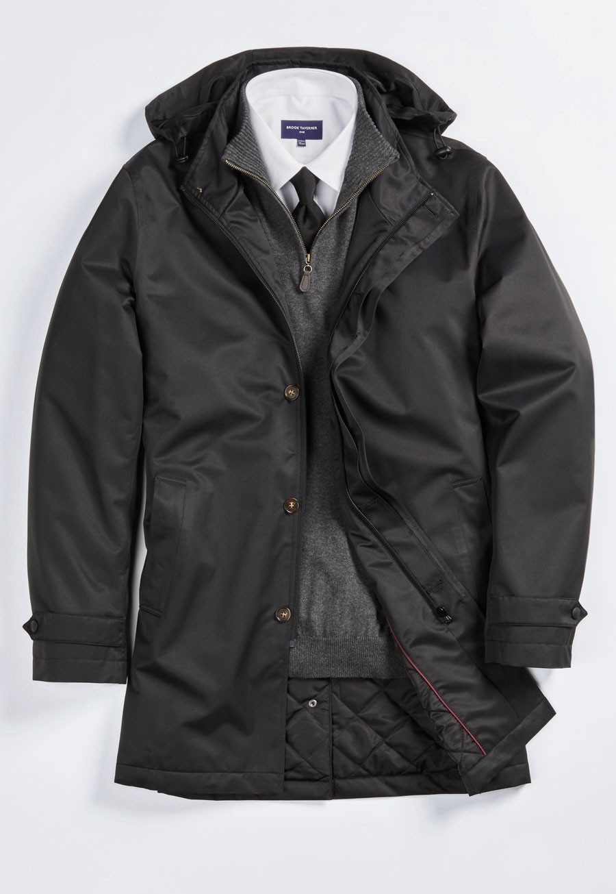 - 5 button fly front with zip, showerproof, centre vent, 2 outer welt pockets, quilted lining with 2 internal pockets, collar incorporating concealed hood, cuff with tab detail