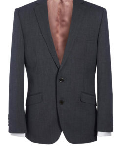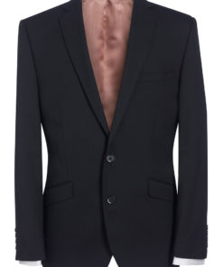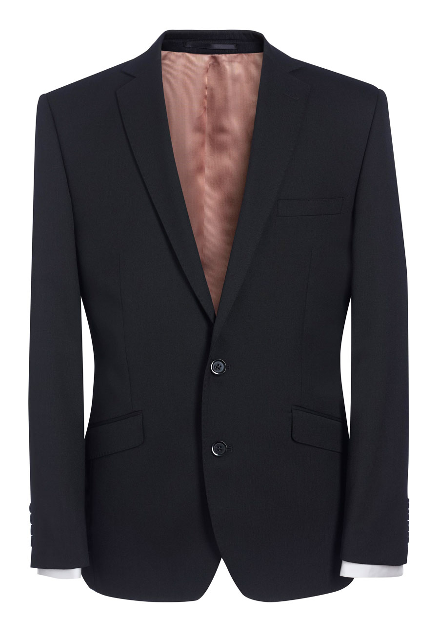 - Slim fit, single breasted, 2 button jacket, side vents, slim lapels with saddle stitching, piano faced interior with slim pocket jets