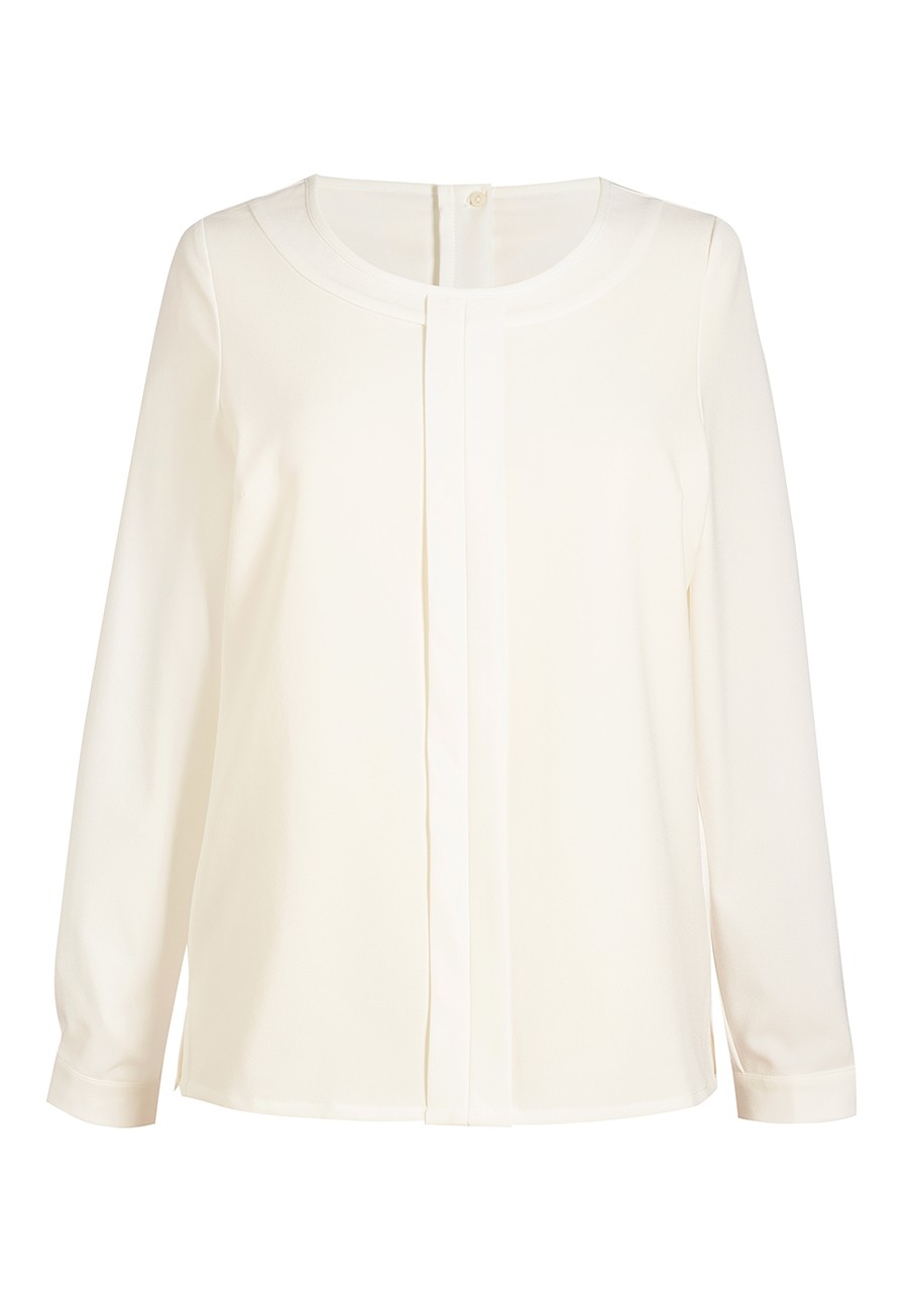 - Long sleeve ladies’ blouse, round neck, front pleat detail, bust darts, single gold button cuff, rear gold zip detail, easy care – machine washable at 30 degrees