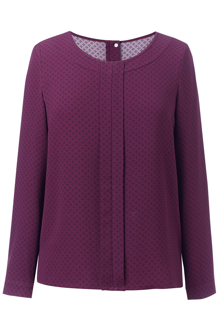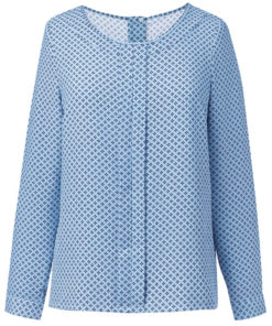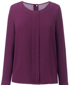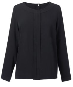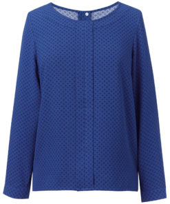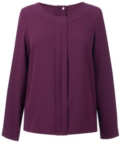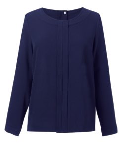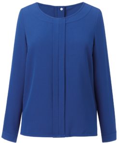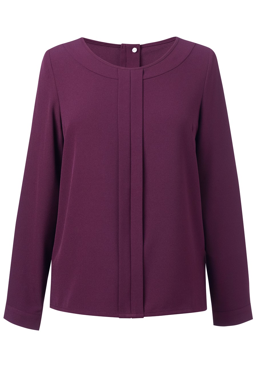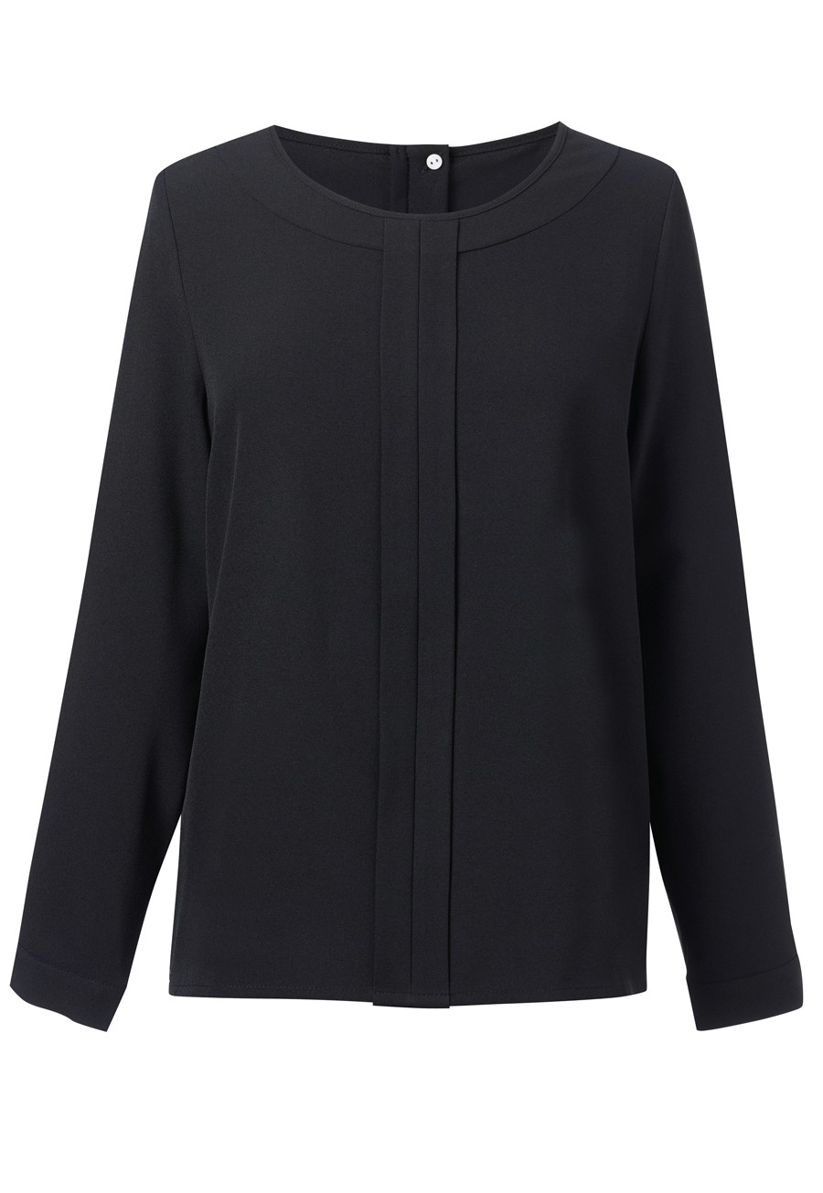 - Long sleeve ladies’ blouse, round neck, front pleat detail, bust darts, single gold button cuff, rear gold zip detail, easy care – machine washable at 30 degrees